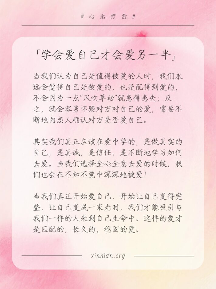 当我们真正开始爱自己,开始让自己变得完整,让自己变成一束光时,我们才能吸引与我们一样的人来到自己生命中。这样的爱才是匹配的,长久的,稳固的爱。