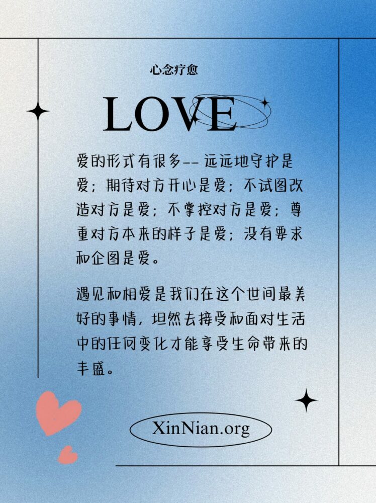 爱的形式有很多—— 远远地守护是爱;期待对方开心是爱;不试图改造对方是爱;不掌控对方是爱;尊重对方本来的样子是爱;没有要求和企图是爱……